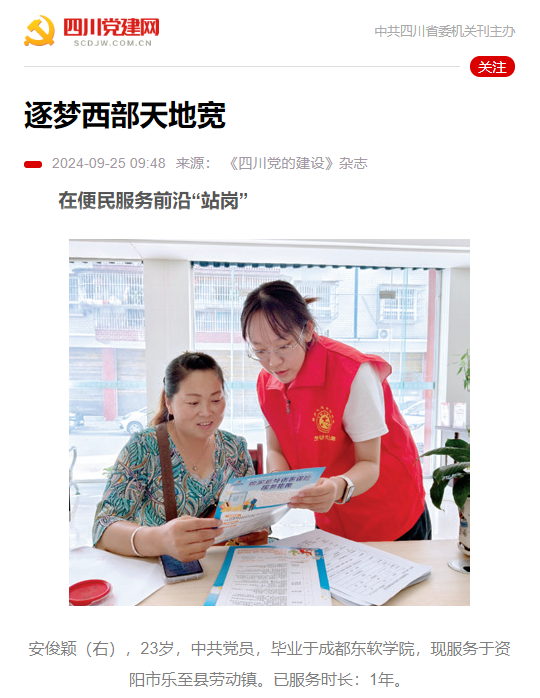 在广袤的西部,有一群怀揣梦想、勇于担当的新青年,他们积极响应团中央的号召,将青春与热血洒在祖国的基层大地。一批批参与西部计划的大学毕业生走出校门,深入四川基层第一线,在教育、医疗、乡村振兴等方面发挥积极作用。安俊颖,毕业于我校数字媒体艺术专业23岁的西部计划志愿者,就是其中一份子。