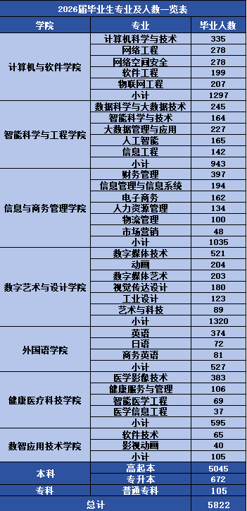 我校2026届毕业生5822人,其中本科5717人,专科105人。本科专业涵盖计算机科学与技术、软件工程、网络工程、网络空间安全、物联网工程、大数据管理与应用、人工智能、数据科学与大数据技术、信息工程、智能科学与技术、财务管理、电子商务、人力资源管理、市场营销、物流管理、信息管理与信息系统、动画、工业设计、数字媒体技术、数字媒体艺术、艺术与科技、日语、商务英语、英语、健康服务与管理、医学信息工程、医学影像技术、智能医学工程;专科专业涵盖软件技术、影视动画。
