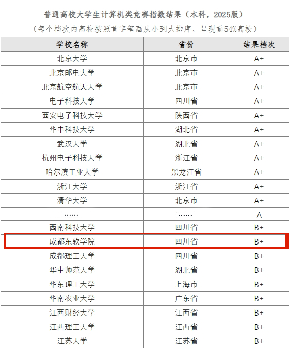 5月19日,全国高等学校计算机教育研究会、教师教学发展研究国家级虚拟教研室和浙大城市学院高等教育数智评价研究中心联合发布普通高校大学生计算机竞赛指数(本科,2025版,以下简称“2025版计算机竞赛指数”)。报告显示,我校稳居四川省民办高校首位,占全国高校分数段前12%,同时,在指数覆盖的全国1176所本科院校(不含职业大学)高校中跻身全国民办高校前三,与中国地质大学(北京)、北京工业大学、成都理工大学等知名高校共同位列B+段。